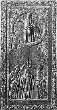 Примерно 400 годом датируется так называемый Бамбергский аворий – резная плакетка из слоновой кости, хранящаяся в Мюнхене. Основной сценой здесь является пришествие жен-мироносиц ко Гробу Господню, дополненное изображением юного безбородого Христа со свитком в руке, идущего по горе к небу. Из сегмента облака видна десница Бога, которая словно «втягивает» Спасителя на небо. Движение Христа достаточно порывисто: левая нога согнута, а правая далеко отставлена назад. Под ступенчатой горкой, по которой восходит Иисус, изображены фигуры двух людей, павших ниц. Описанная композиция по-разному трактовалась исследователями. Известнейший ученый-византинист Н.П. Кондаков считал, что она показывает не Вознесение, как это утверждал Н.В. Покровский, а сам момент Воскресения Христа[2]. Фигуры у подножия горы он понимал как изображения двух поверженных римских стражей, а не учеников Господа, так как последних должно было быть двенадцать. Стоит, однако, отметить, что в христианском искусстве изображение самого главного момента Евангельской истории – момента Воскресения – отсутствует, его не описывают святые евангелисты и о нем не говорят церковные песнопения. В свою очередь Н.В. Покровский убедительно трактовал изображенное на плакетке Вознесение как своего рода буквальную иллюстрацию на текст Деяний святых апостолов, где о Воскресении и Вознесении Иисуса говорится: «Сего Иисуса Бог воскресил, чему мы все свидетели. Итак, он быв вознесен десницею Божиею…» (Деян. 2: 32–33)[3]. В средневековом искусстве западнохристианского мира подобные изображения Вознесения встречаются достаточно часто, что, вероятно, связано еще и с тем, что на латыни слова «вознесение» и «восхождение» обозначаются одним словом – ascensus.